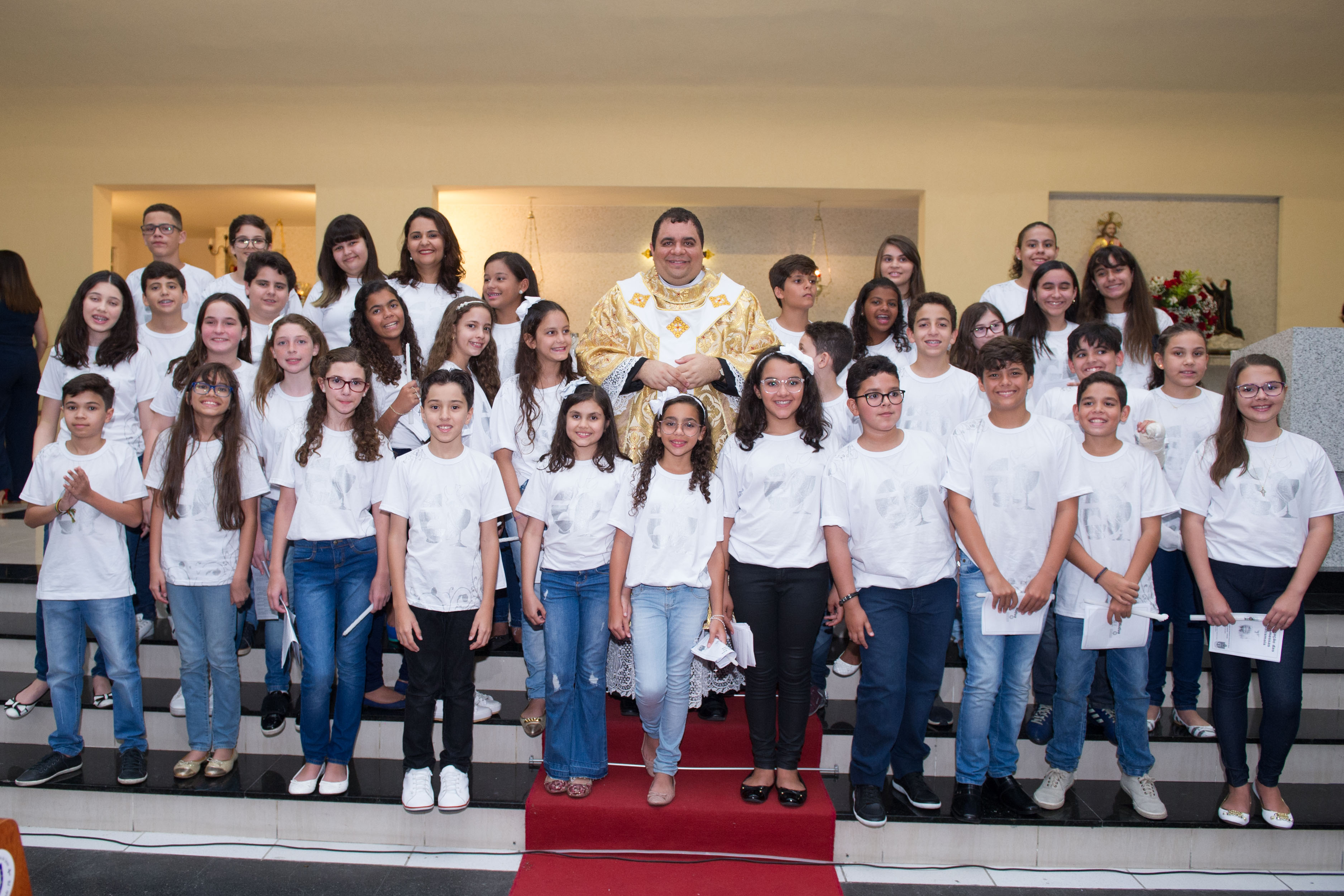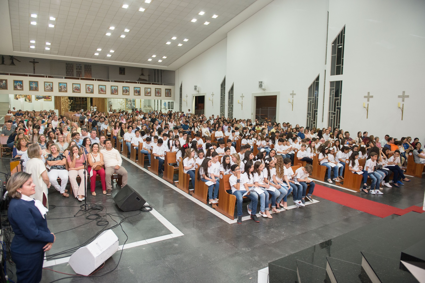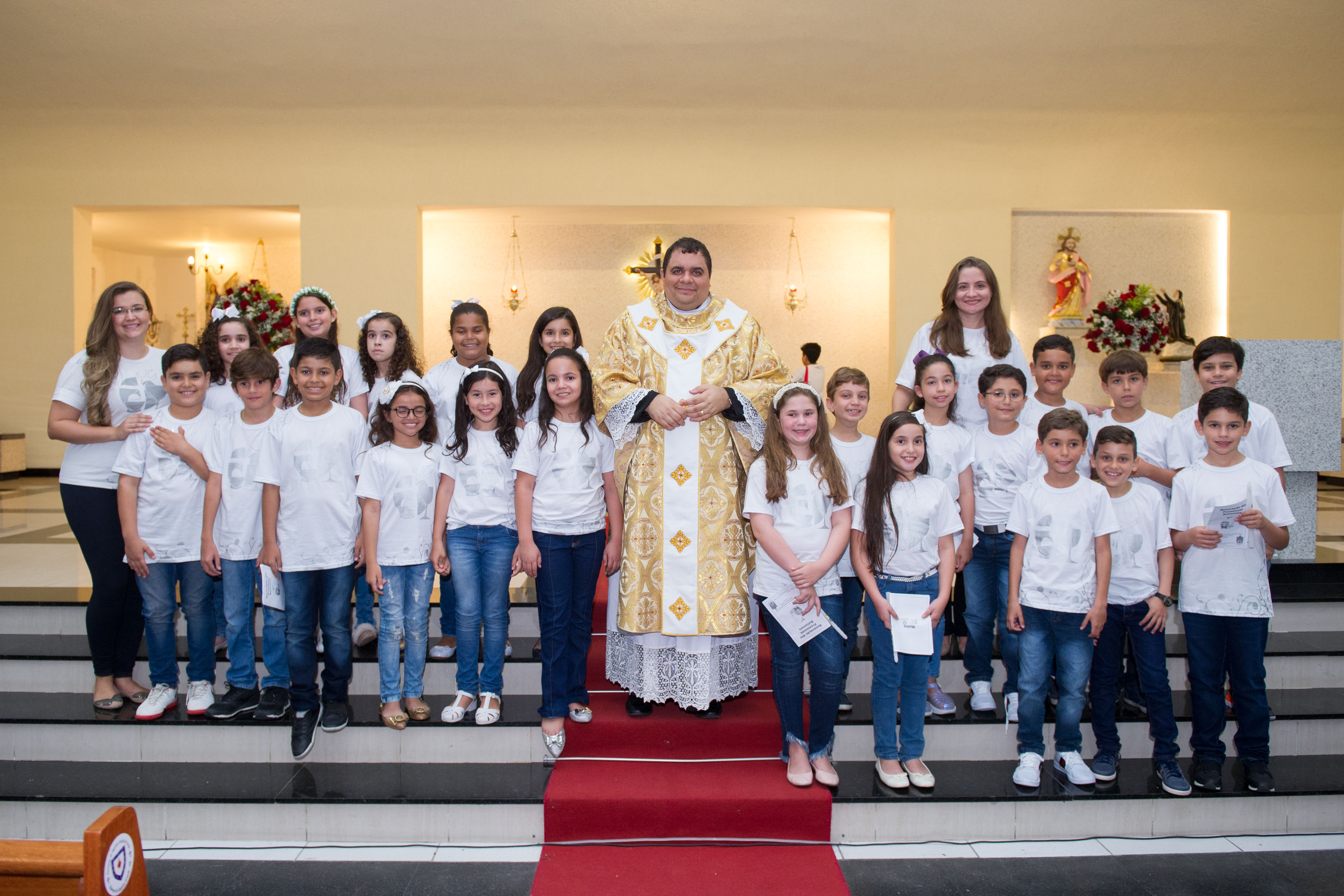 A cerimônia aconteceu no sábado (20) e foi presidida pelo padre Hachid Ilo. Familiares das crianças e a equipe do Colégio Motiva prestigiaram a celebração, lotando o santuário para testemunhar a concretização, na vida das crianças, de um dos Sacramentos da Igreja Católica: a Primeira Comunhão, que relembra o sacrifício da cruz com a simbologia do recebimento do Corpo e Sangue de Cristo.