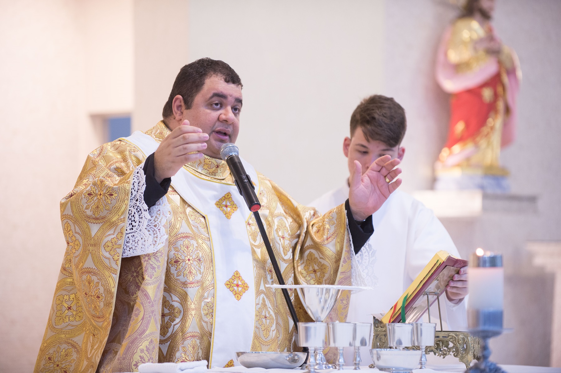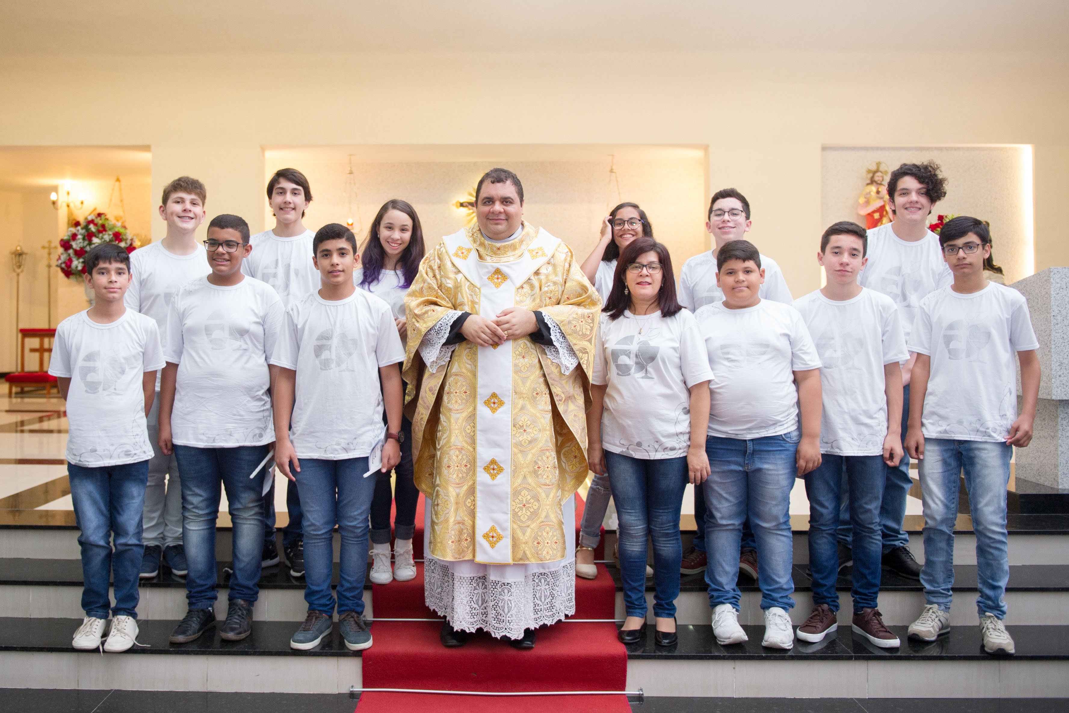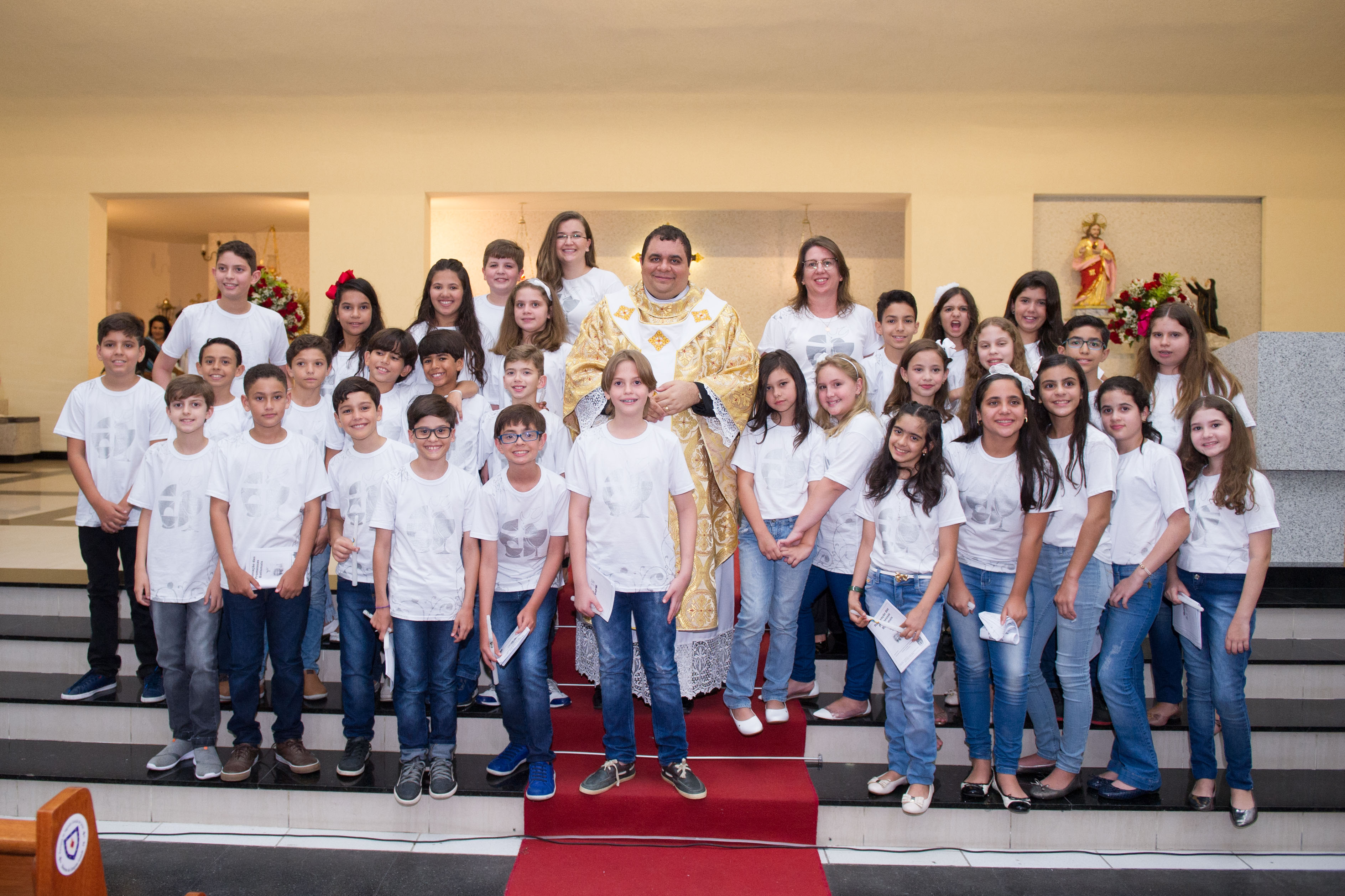 A cerimônia aconteceu no sábado (20) e foi presidida pelo padre Hachid Ilo. Familiares das crianças e a equipe do Colégio Motiva prestigiaram a celebração, lotando o santuário para testemunhar a concretização, na vida das crianças, de um dos Sacramentos da Igreja Católica: a Primeira Comunhão, que relembra o sacrifício da cruz com a simbologia do recebimento do Corpo e Sangue de Cristo.