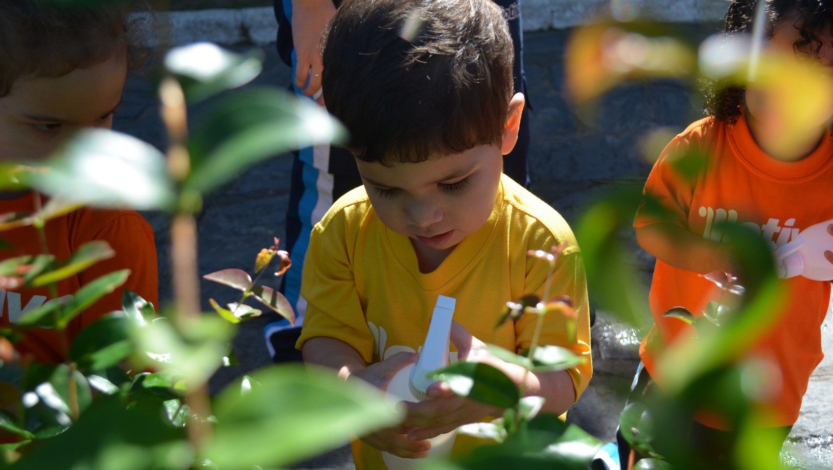 As turmas da Educação Infantil, também, foram engajadas nas atividades de conscientização, a partir de momentos de vivência que proporcionaram o contato direto com a natureza, nas áreas verdes da escola. Elas ouviram as professoras falarem da importância dos recursos naturais e foram conduzidas a regarem as plantas, como um gesto de carinho e respeito com a natureza. O momento foi pensado para despertar, nelas, essa relação de harmonia com os recursos naturais, pois é de todos a responsabilidade da preservação do Meio Ambiente para as atuais e futuras gerações.